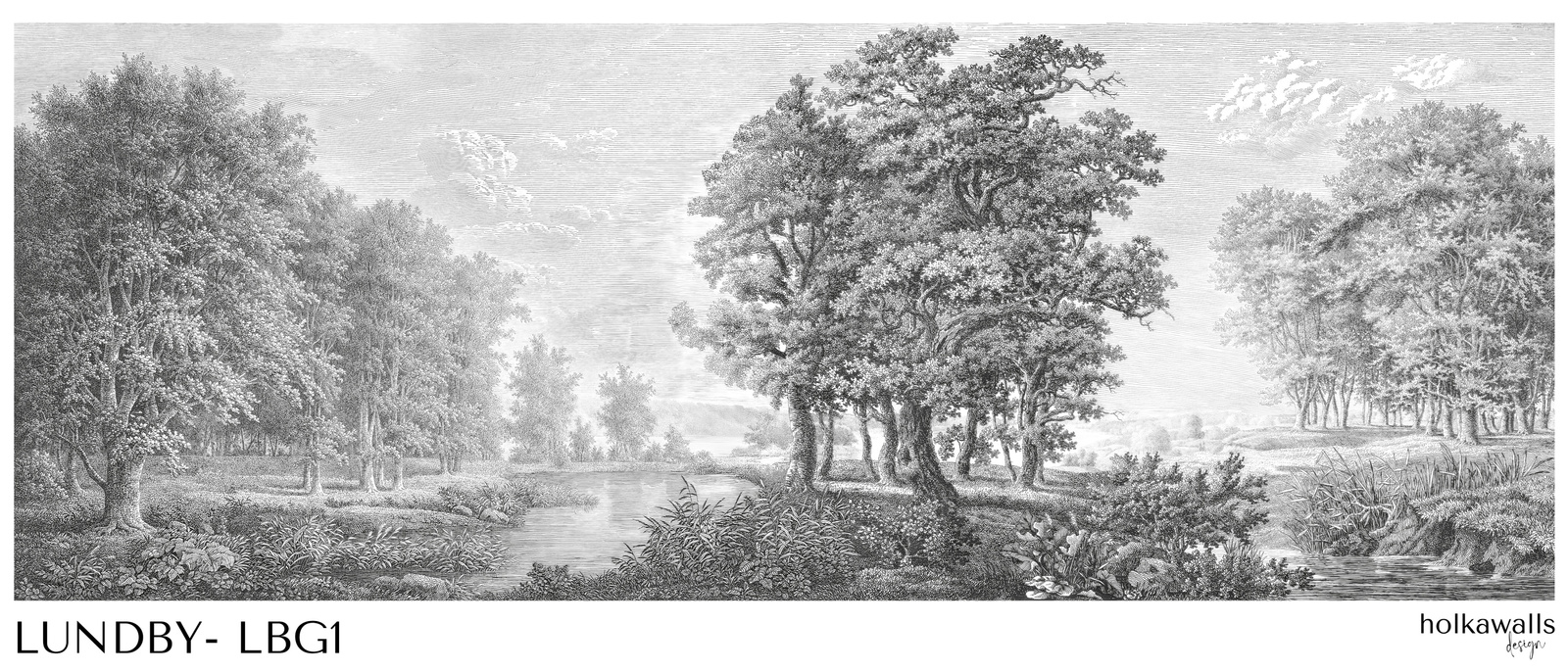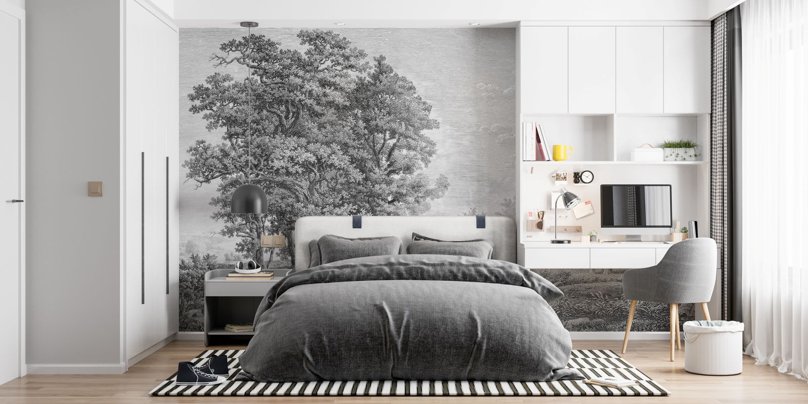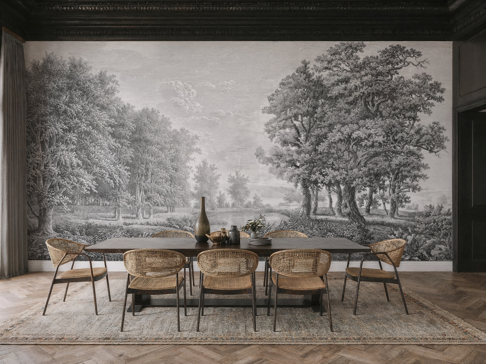 Tapeta winylowa o strukturze płótna z motywem lasu w stylu vintage w odcieniach szarości.