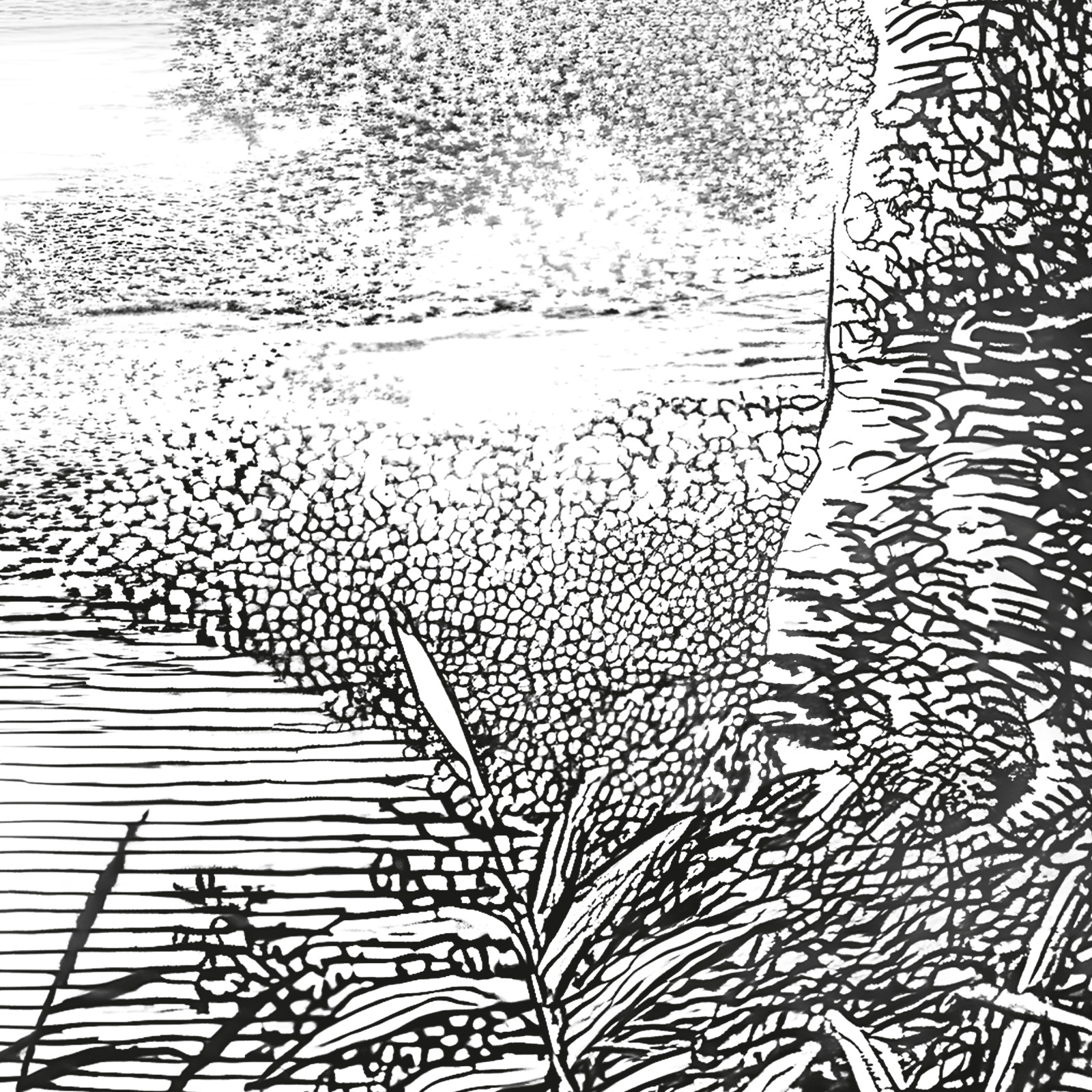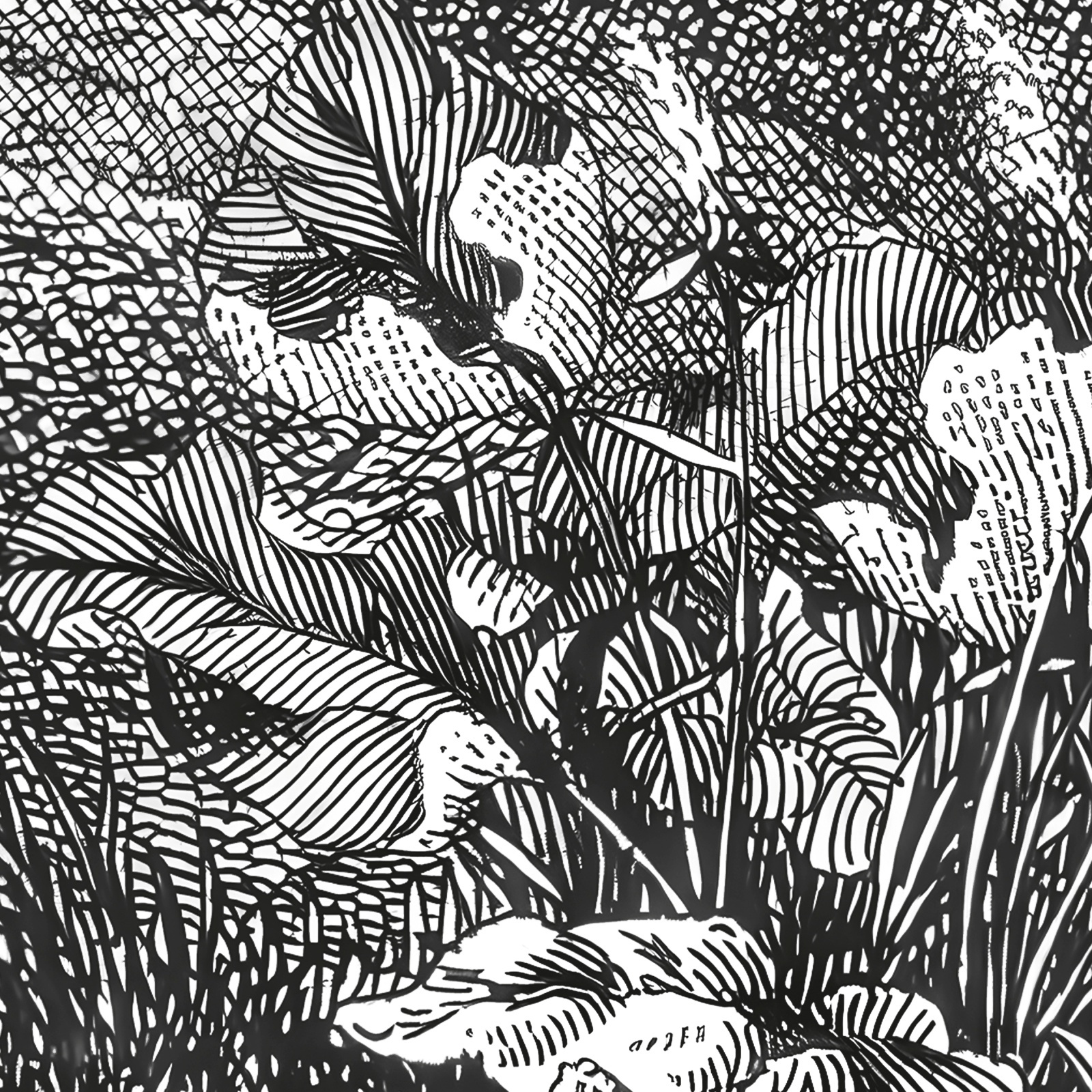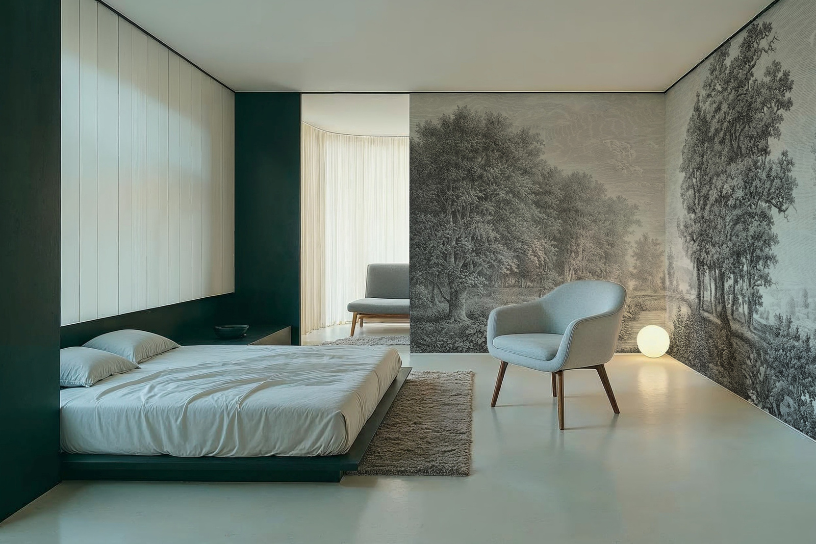 Tapeta winylowa o strukturze płótna z motywem lasu w stylu vintage w odcieniach szarości.