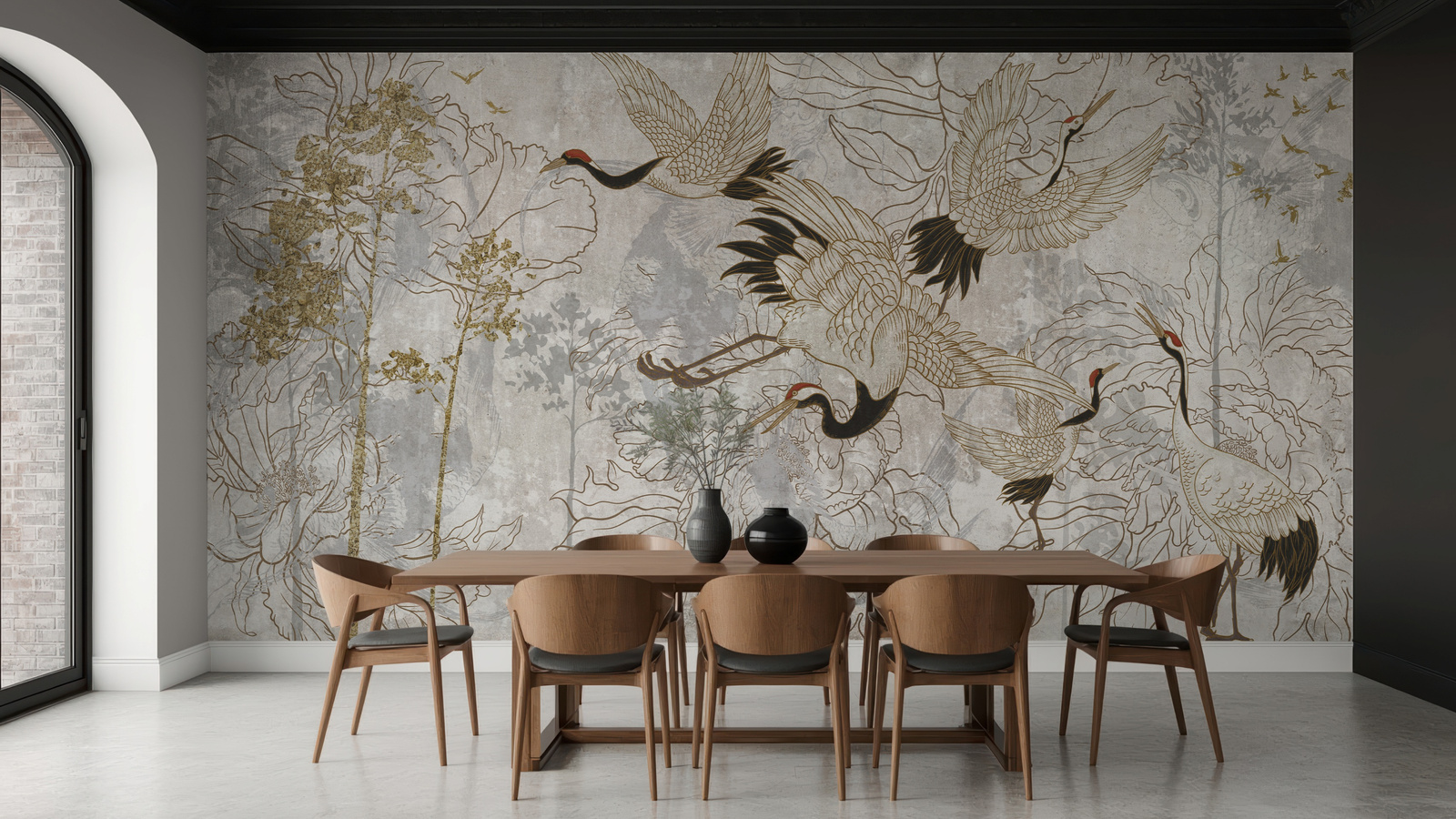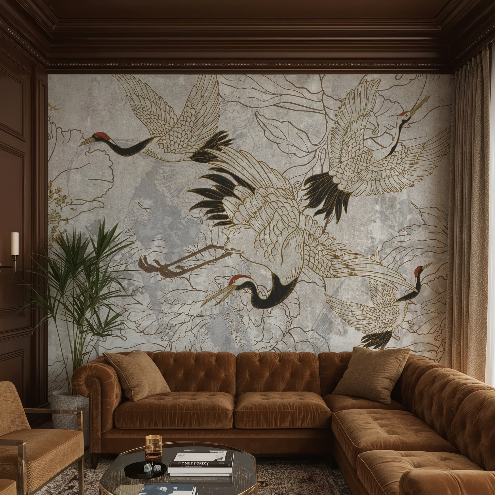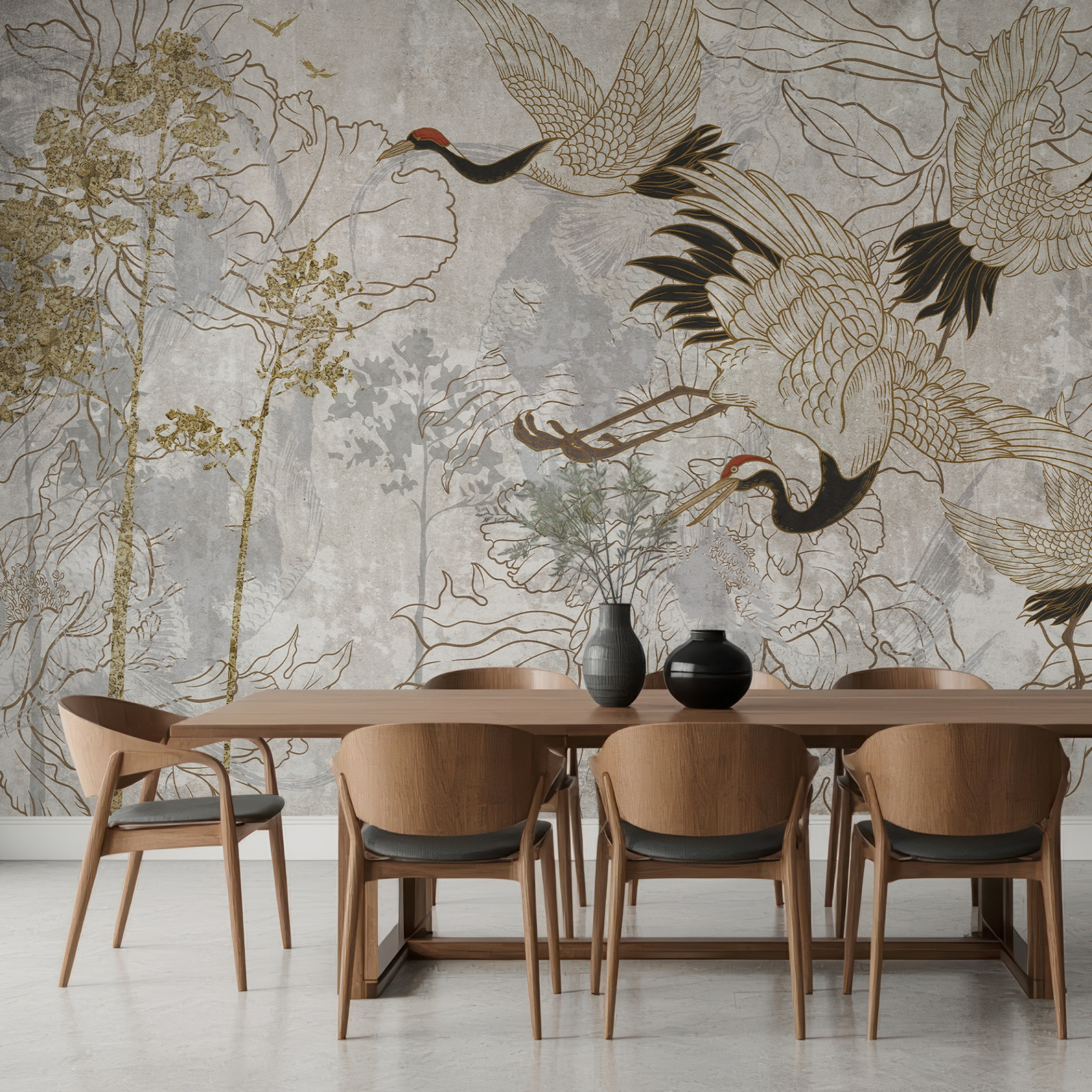 - Tapeta winylowa o strukturze płótna z żurawiami w orientalnym stylu.
